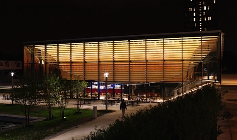 In het hart van de Erasmus Universiteitscampus te Rotterdam is een Studentenpaviljoen gerealiseerd dat zijn deuren in september 2013 opende. Het gebouw ligt vrij tussen de overige gebouwen in een parkachtige omgeving en huisvest horeca ruimte, vrij toegankelijke werkplekken en een theaterzaal. De theaterzaal is bedoeld voor kleine uitvoeringen, debatten, presentaties en feesten. Het biedt plaats aan 160 zitplaatsen op een inschuiftribune. Wanneer deze is ingeschoven is de zaal geschikt voor 350 personen. De zaal ligt op de eerste verdieping en wordt omringt door de horeca ruimte en open werkplekken. Het vierkante gebouw is bijzonder duurzaam en heeft aan vierzijde een glasgevel met zonweringslamellen. Vanwege de duurzaamheidsopdracht maakt de theaterzaal enkel gebruik van LED-schijnwerpers en ontbreekt een dimmerruimte.